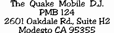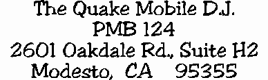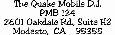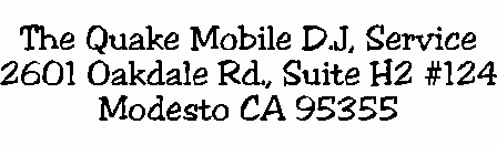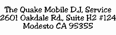 The Quake offers you all varieties of music such as the latest in Top "40", Country, 50's Oldies, Motown, Big Band, Alternative, Rock, House, 80's Retro, Contemporary, Jazz, and Techno. Spanish music available upon request. Our Entertainment services includes music of your choice, A professional sound system, formatting your event by appointment basis, a computerized Light show, fog or bubble machine, strobes, and a master of ceremonies is available if desired. The Quake encourages one or two appointments in our office and studio prior to your day.